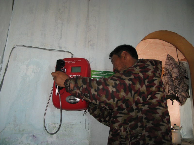 В селе, из десятка домов, есть спутниковый таксофон, но нет магазина, где можно купить телефонную карту, нет дороги, а до ближайшего посёлка 80 км. Есть автозимник, но он растаял. Местные, научились пользоваться таксофоном, бесплатно...