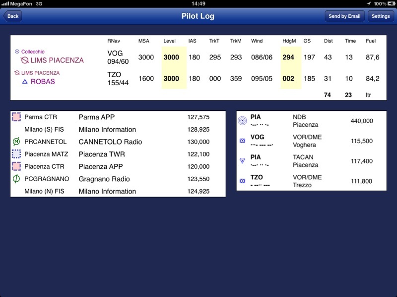 Преодолев последний горный хребет, начали снижаться, впереди была равнина, которая лежит между Альпами на севере и Апеннинами на юге. Через некоторое время Гармин начал сообщать, что впереди зона военных полетов. Я ее определил по карте Гармина как большой прямоугольник с границами фиолетового цвета и приделанный к ему круг с границами синего цвета с центром в точке NDB Пьяченца. И принялся их старательно облетать. Позже выяснилось, почему я не мог связаться с Милан-информация - у них в этой зоне хронические проблемы со связью, да и горы точно не способствуют распространению радиоволн.