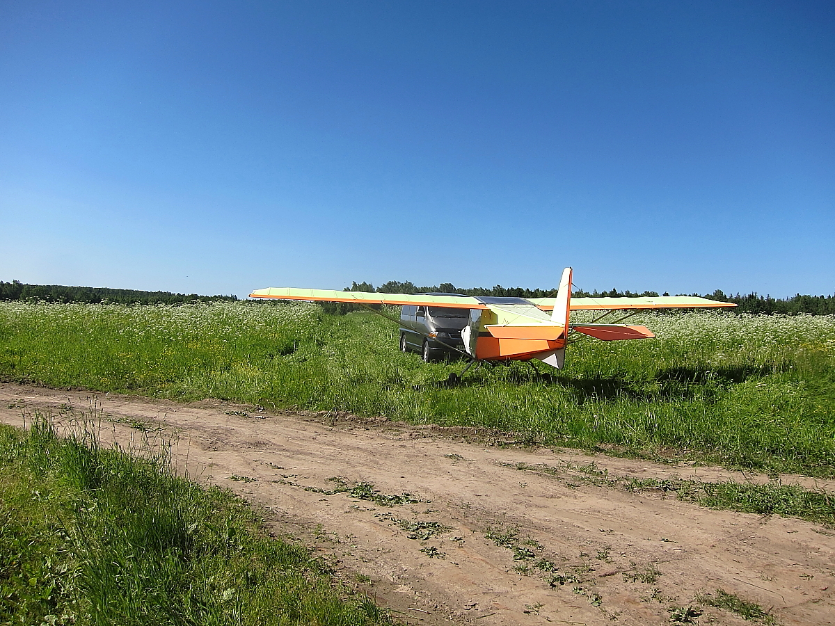 Не торопясь самолетик встал на колеса. Еще через несколько дней пригорки подсохли и самолетик начал свое первое летнее путешествие. С помощью сочувствующих малой авиации аборигенов, вынесших Скай из топи практически на руках, мы быстро продвигались навстречу свободе! Ну вот мы и на ПОЛЕ, разворачиваюсь против ветра