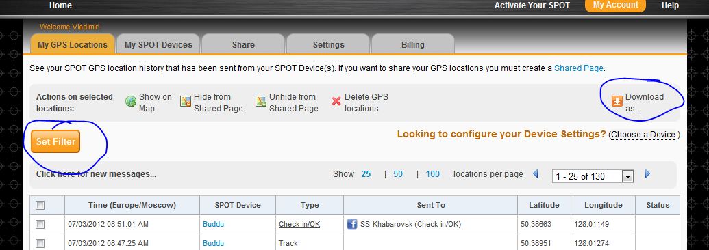 Миша, с shared page трэки сгружать практически сложновато. Их тривиально экспортировать в GPX или KML формате из личного кабинета СПОТ-а. Хранятся 30 дней. Если дашь имя/пароль по email, я сделаю.Misha писал(а):Может ли кто-нибудь (lt.ak'a даже не прошу) сделать карту нашего маршрута, пока хранятся треки на СПОТе? Буду безмерно признателен!