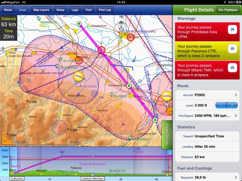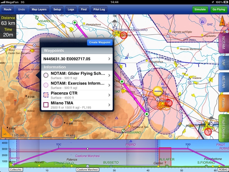 Преодолев последний горный хребет, начали снижаться, впереди была равнина, которая лежит между Альпами на севере и Апеннинами на юге. Через некоторое время Гармин начал сообщать, что впереди зона военных полетов. Я ее определил по карте Гармина как большой прямоугольник с границами фиолетового цвета и приделанный к ему круг с границами синего цвета с центром в точке NDB Пьяченца. И принялся их старательно облетать. Позже выяснилось, почему я не мог связаться с Милан-информация - у них в этой зоне хронические проблемы со связью, да и горы точно не способствуют распространению радиоволн.