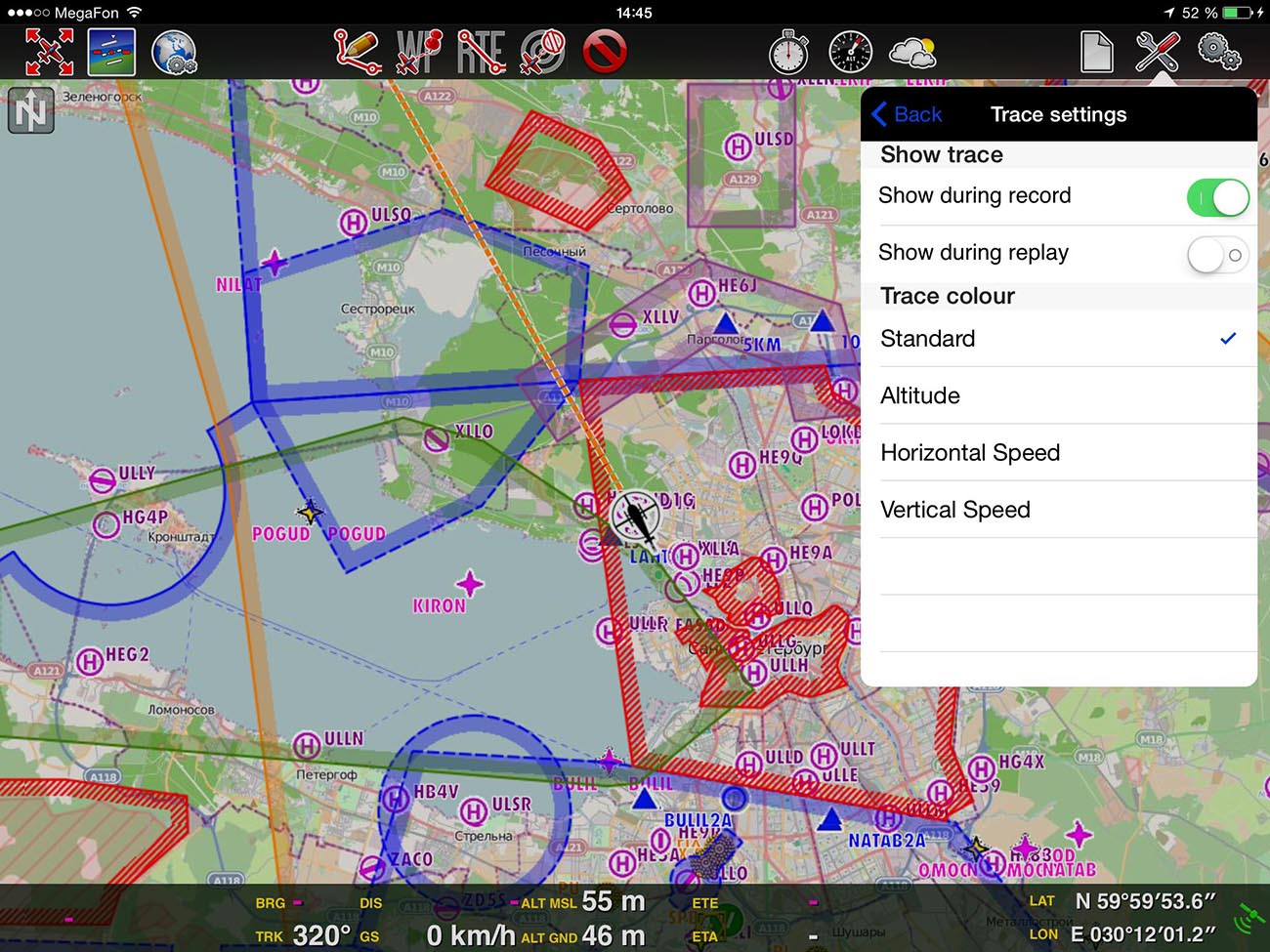 Tools - Flight recorder - Активировать выключатель "Flight recorder" - Далее идем в "Trace setting" - В настройках Show trace активируем Show during record Ниже можно выбрать цвет трека - Стандартный (белый)
