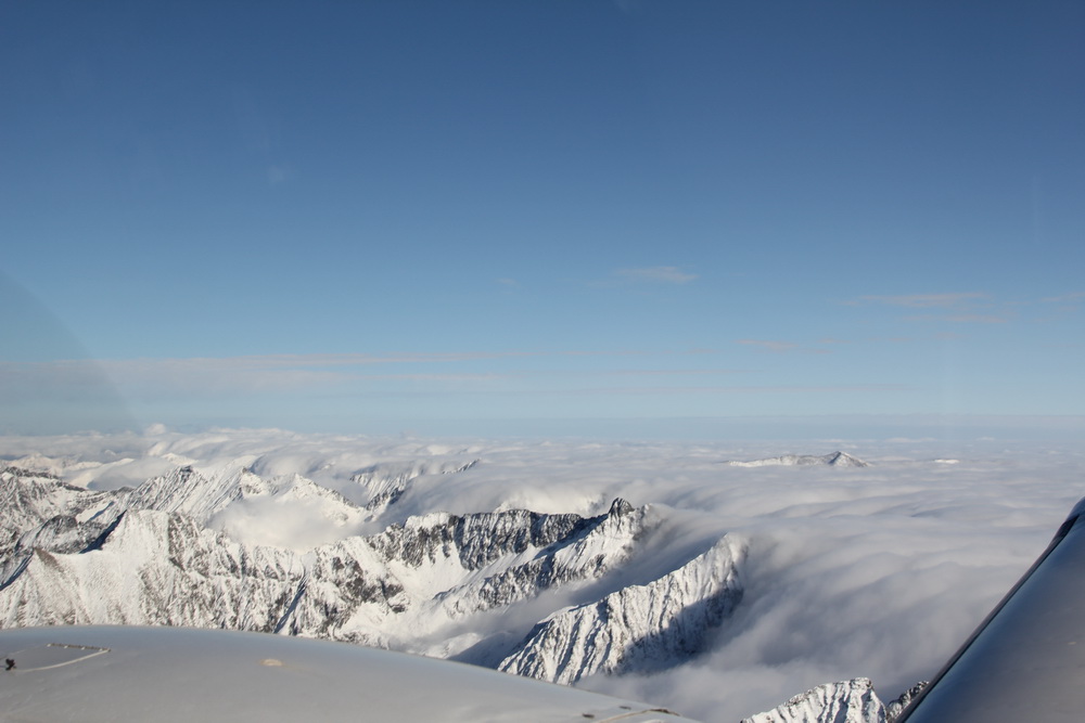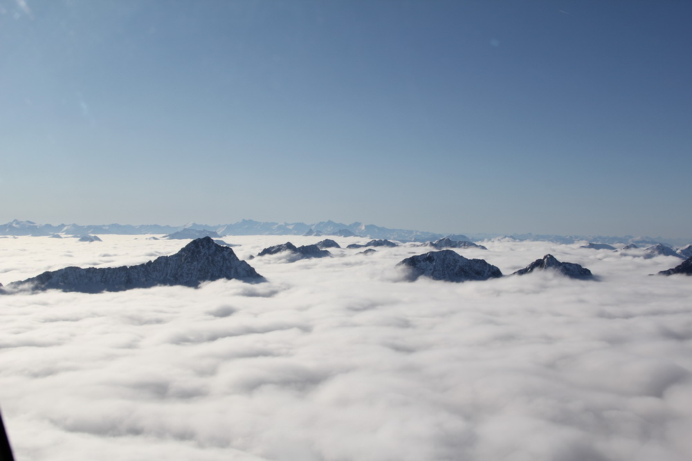 Ну вот, сразу бы так, настроение улучшилось , перекладываю рули в набор. Через несколько минут мы выскакиваем над облаками! Под нами белоснежный ковер, местами из него виднеются пики гор, как будто волшебные замки построенные на снежной равнине... Облака освещает яркое солнышко и создается впечатление , что ты в Альпах... ну так мы и есть в Альпах!! В самолете все замерли от красоты, можно было фотографировать все подряд! 2 часа над облаками среди пиков гор... Это вам не на маленьком вертолетике где то над автобаном ...