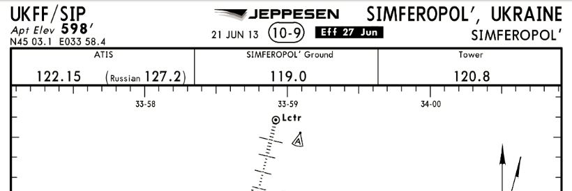 В общедоступной версии Jeppesen код Симферополя UKFF. Крайний апдейт схемы 10-9: 21 jun 13.
