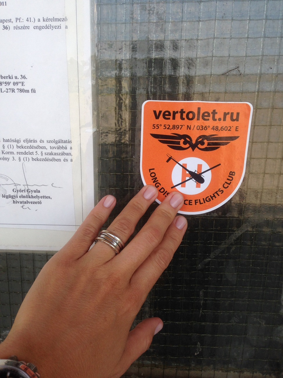 Мне очень захотелось его поддержать, поэтому, несмотря на строгий наказ Misha относительно мест расклеивания наклеек vertolet.ru – только в больших аэропортах и местах высокой концентрации пилотов - я, по-партизански незаметно для окружающих, оставила на его двери trendy shiny orange guide mark…