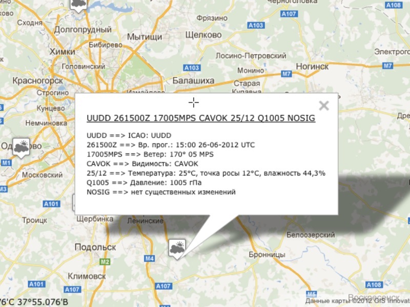 В данном случае наблюдались (OBS) и прогнозоировались (FCST) скрытые в слоях кучево дождевые (EMBD) а также гроза с градом (TSGR) в районе с координатами..., высотой до эшелона..., и хреначащие со скоростью 20 км/ч в направлении к нам. Если ты пытаешься увидеть быстро двигающуюся грозу в прогнозе ветра на эшелонах, то хрен ты её там когда найдешь. И из окна она у меня на юге смотрелась пару часов назад совсем не по детски, хотя и прошла мимо.