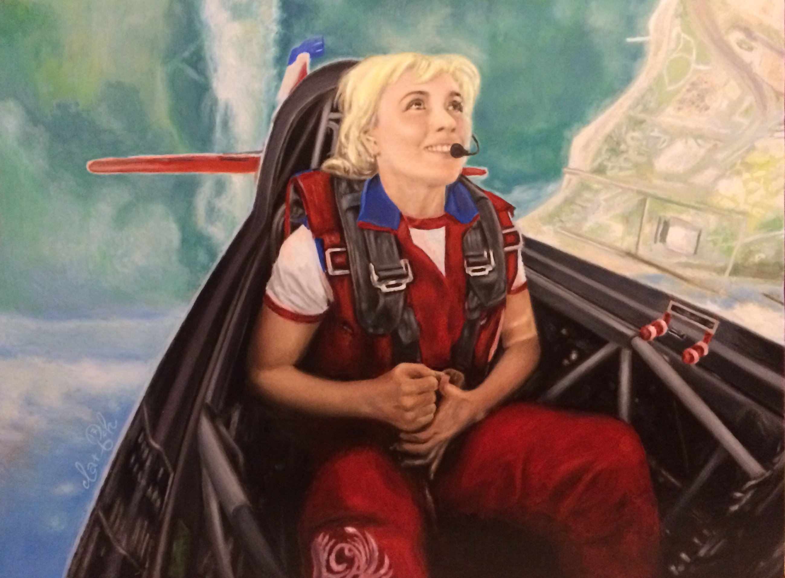 Светлана Капанина - семикратная абсолютная чемпионка мира, легендарный пилот столетия, крутит сложнейшие кульбиты в небе олимпийского Сочи. На картине изображен момент, когда самолёт находится в перевёрнутом состоянии, но при этом действует положительная перегрузка, море сверху, небо снизу.