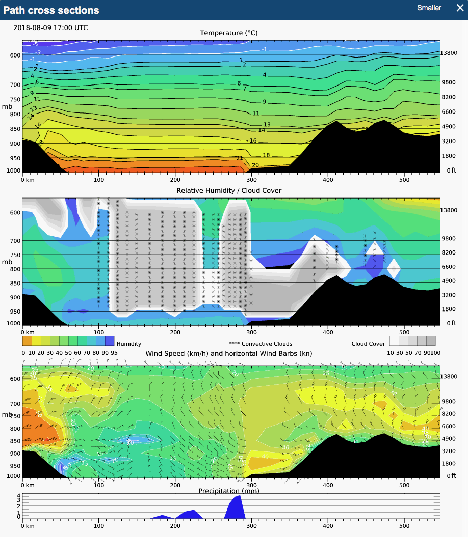 На метеограммах отображаются данные ветра, влажности, облачности, ветра, осадков и обледенения. В этом смысле, эта фишка MeteoBlue дублирует такие сервисы, как Ogimet.com и мой любимый Autorouter.aero, но функционал этих метеограмм, на мой взгляд, даже несколько шире, чем у конкурентов.