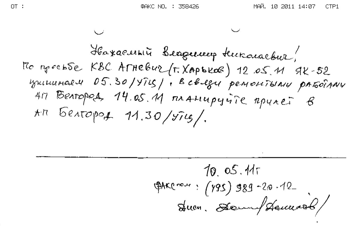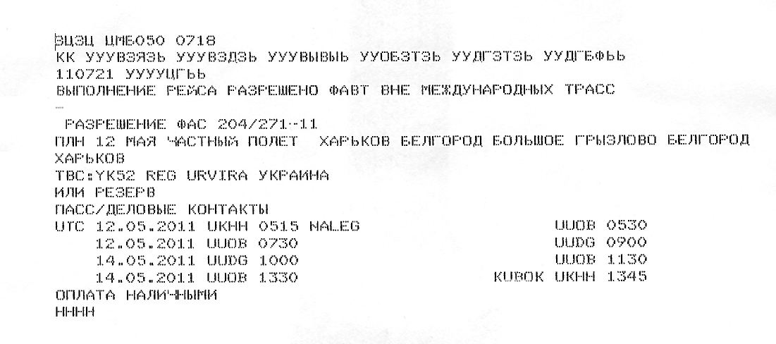 Тут Белгород позвонил. У нас ремонт полосы, если хотите прилететь, то прилетайте до 09.30 МСК. Блин! Созванивались же накануне. ничего не сказали про ремонт. Звоню в Киев. корректируем время украинского разрешения - ответ пришел через 4 минуты.