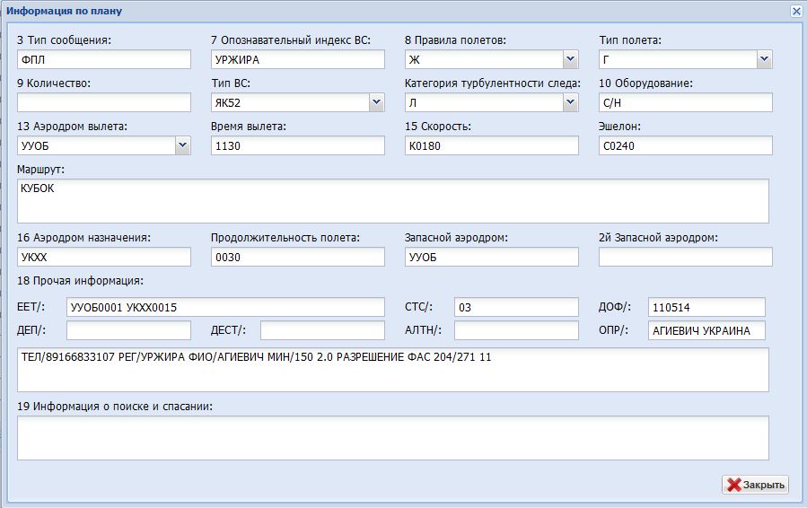 Далее раздался звонок и случилась небольшая истерика со стороны специалиста МЗЦ, что мол они нам не АДП, и подавайте сами из АДП Белгород. Беседа длилась минут 11 в попытках рассказать, что пилот в настоящий в момент не находится в Белгороде, а когда будет находиться, у него будет очень мало времени перед закрытием полосы на ремонт, и что ФАП-128 отменил вообще понятие АДП, и что ФП ИВП разрешил подавать планы через любой орган ОВД, на 10-й минуте трубка меня спросила "Владимир Владимирович, это Вы?", после получения утвердительного ответа план был принят.