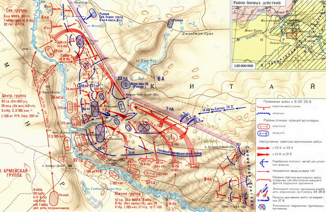 В мае 1939 г., под предлогом "нерешенного территориального спора" между Монголией и Маньчжурией, японские войска вторглись на монгольскую территорию в районе реки Халхин-Гол (Номонган). Целью нападения Японии была попытка установить военный контроль над регионом, граничащим с Забайкальем, что представляло бы непосредственную угрозу Транссибирской железнодорожной магистрали - главной транспортной артерии, соединяющей европейскую и дальневосточную часть страны, которая в этом районе идет почти параллельно северной границе Монголии и в непосредственной близости от нее. В соответствии с заключенным в 1936 г. между СССР и МНР Соглашении о взаимопомощи, в отражении японской агрессии вместе с монгольскими принимали участие советские войска.