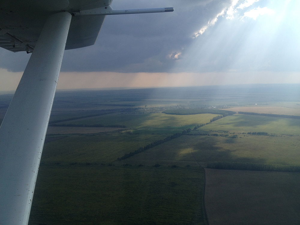 Все! На сегодня хватит. Мы уже изрядно устали, ведь за плечами половина маршрута. Нужно поужинать и спать. Покушали, очень вкусная еда в местной кафешке, а судя по сцене и стоящей на ней аппаратуре - у них вечерами живая музыка. :) Нам принесли ключи от номера где мы будем спать, мы налили чаю и вышли на улицу. Сели за столик, поговорили с местным РП - очень хороший дяденька, добрый. Открыли ноутбук, посмотреть что с погодой на завтра и вообще. Опа!!! :shock: Гроза серьезная идет. Причем прямо сейчас. Поднимаем глаза на горизонт - мрак! Завтра мы не вылетим. Что делать? Александр начал звонить своим знакомым в Казани, которые были готовы принять нас на ночлег в районе п. Сюкеево, аэродрома там нет и он попросил их машинами в более или менее ровном поле накатать нам полосу для посадки и скинуть ее координаты по СМС. Уже весело! :) Сдаем ключи от номера и на вылет, на Казань. Решили свалить, причем по уведомительному порядку не подавая заявки. Предупредили просто местного РП и улетели. Получилось. Гроза была точно за нами, причем догоняла. Казань была тоже закрыта, пришлось сделать крюк, лишних так 200 километров для обхода. Подходили с юга к Казани.