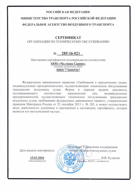 Получили сертификат на техническое обслуживание по ФАП 285