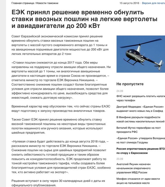 12 августа появилась новость о том, что "ЕЭК обнуляет ставки ввозных пошлин на легкие вертолеты и авиадвигатели до 200 кВт до 2018 г." (http://www.finanz.ru/novosti/aktsii/eek ... 1001351877)