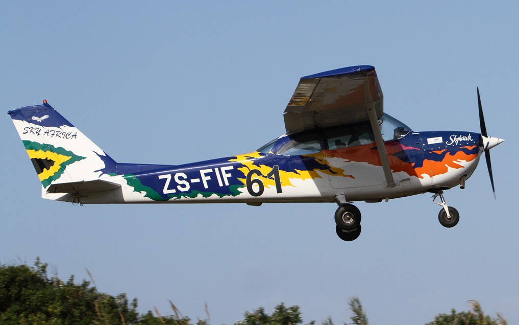 C 172E. Отличительная особенность машин с двигателем О-300 - торчащие вертикально вниз два выхлопных патрубка, расположенные близко к носу.