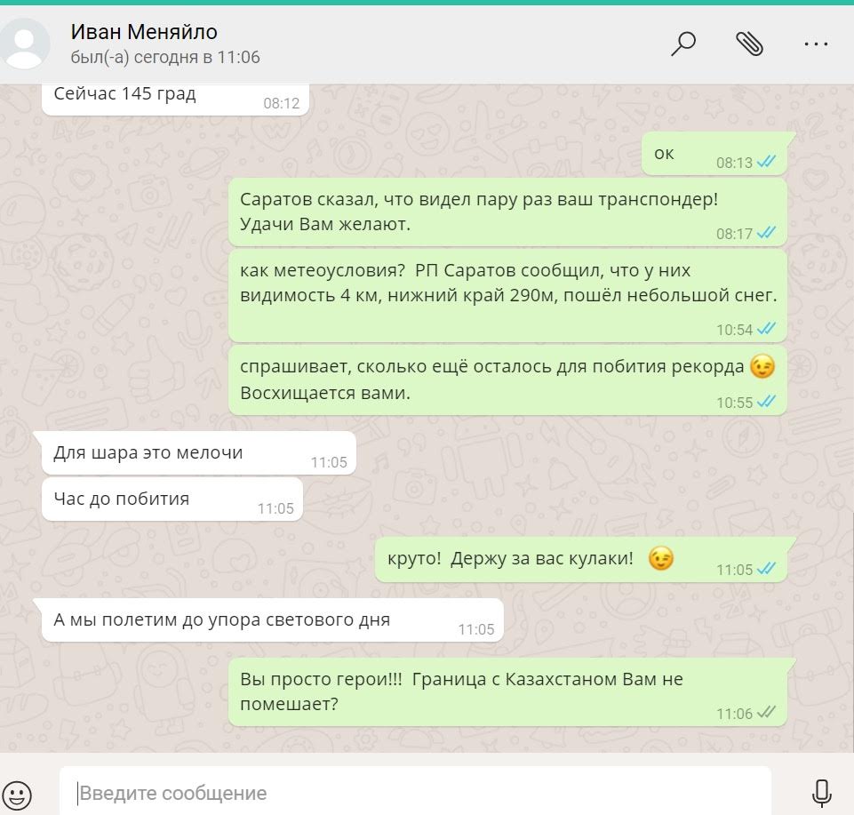Таким образом рекорд будет поставлен с большим отрывом от прошлого обладателя. "Час до побития, - сообщил Иван Меняйло в своём сообщении, - а мы полетим до упора".