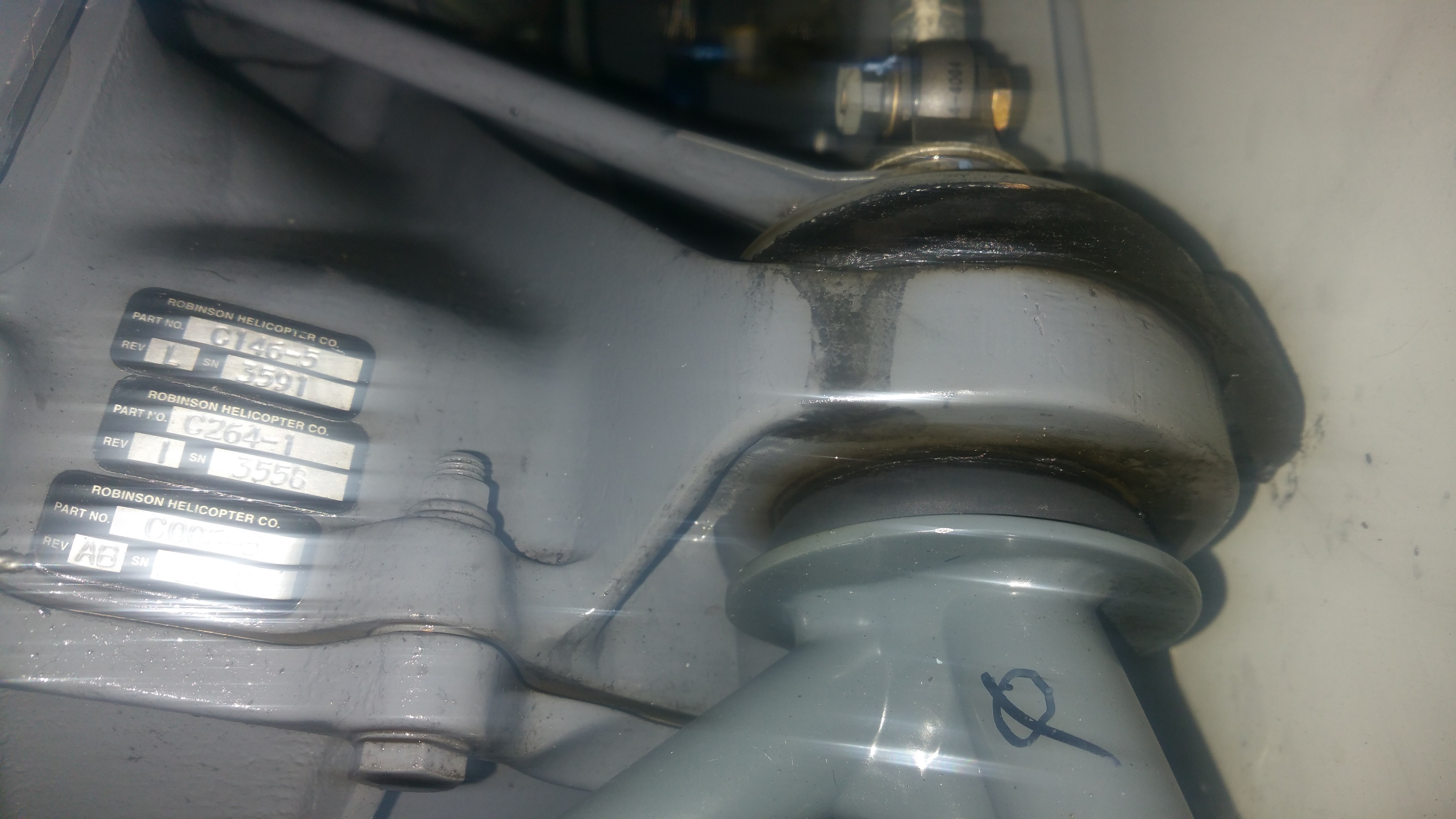 Второй подтвержденный случай проблемы с подушкой редуктора (правая передняя по полёту) на R-44. Возможная причина разрушения подушки- подтёк гидравлической жидкости. Следы подтека на обнаруживались на редукторной деке. Подтек гидравлики незначительный, вся уходящая жидкость стекала в узел крепления редуктора и там оставалась.