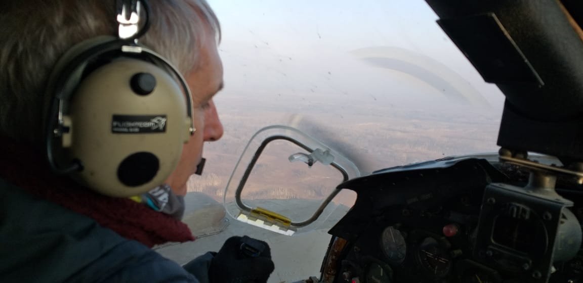 - Внутри кабины Дорнье. Слева направо, пилот (и совладелец Contact Airways) Джек Бержерон и биолог Дэйв Вули. Ведущий биолог, проводивший исследование, сел на место штурмана справа от пилота и убедился, что мы летели вдоль участков исследования.