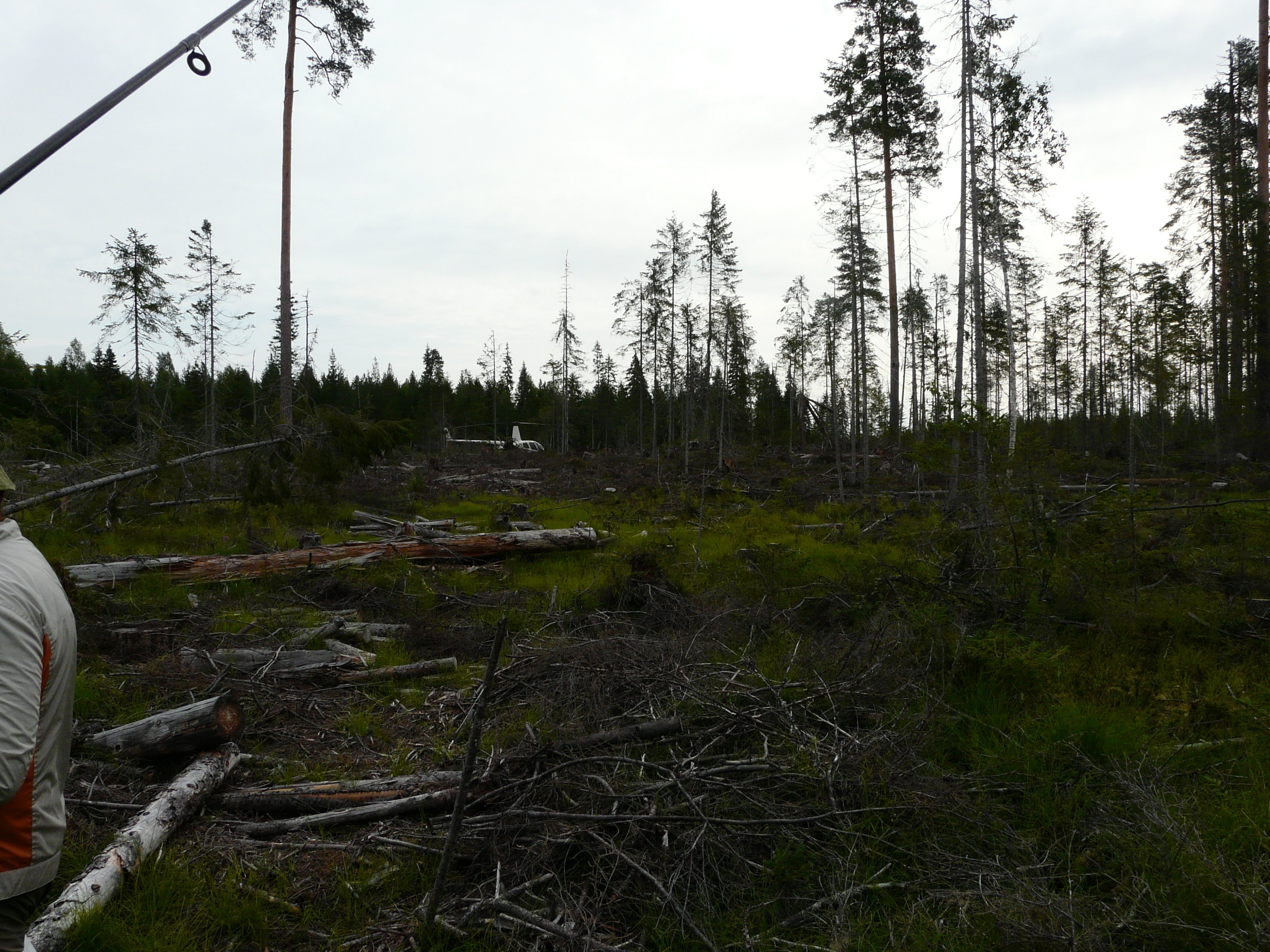 Так и есть. Облетев озеро мы не нашли места для посадки. Лес и болота вплотную подходят к воде. Но, снимки по которым я искал озеро оказались старыми. В нескольких местах у озера появились вырубки. Ну прилетели уже! Садимся!