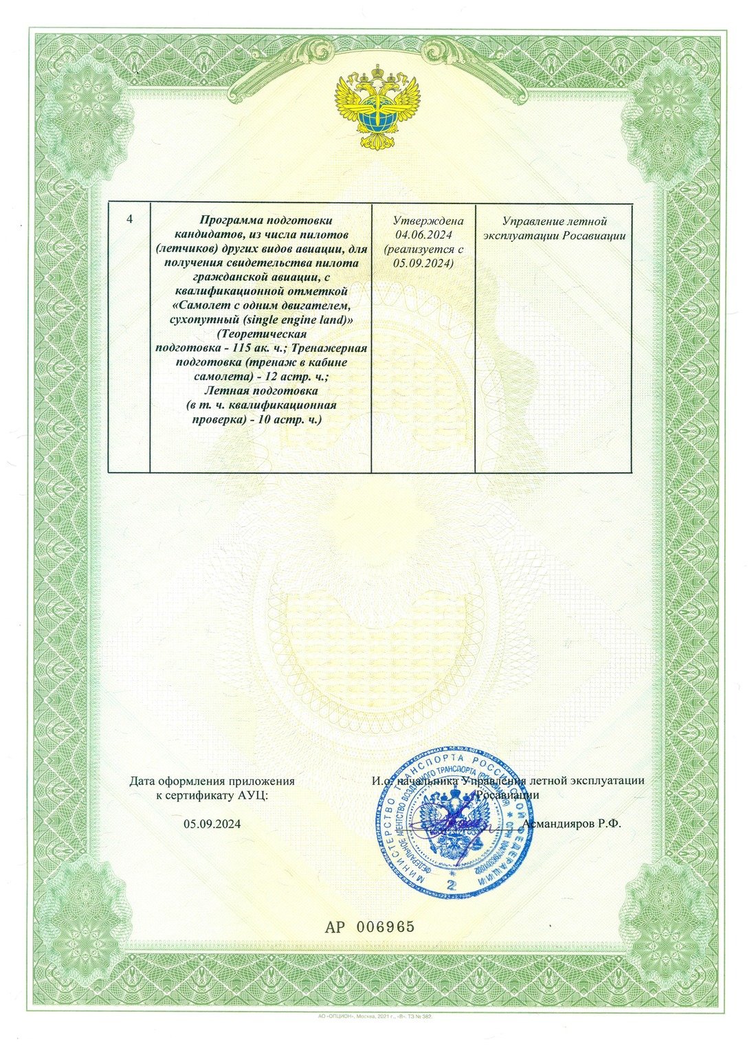 3. Обновлена и утверждена программа подготовки кандидатов для получения свидетельства частного пилота с квалификационной отметкой "Самолет с одним двигателем, сухопутный (single engine land)". Оптимизировано количество учебных часов;