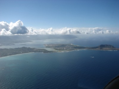 Несмотря на кажующееся обилие воды вокруг островов :wink: понятно что никто не приводняется в открытой воде, поэтому типичный тренировочный полет выглядит следующим образом - взлет с одной из Honolulu-шных водных полос, далее вдоль побережья на восток сначала до Diamond Head (можно помахать купающимся на пляжах Waikiki :wink: ), потом до Koko Head, поворачиваем на северо-восток и до Makapuu Point, затем доворачиваем на северо-запад и по прямой до Kaneohe Bay, точнее южной его части (так и именуемой по радио - South Bay) ...
