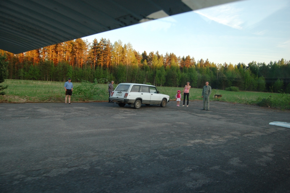 Долетев до площадки мы выполнили проход, развернулись и сели. Деревья и кусты по торцам мешали посадке, в багажнике их дожидалась бензопила. Времени было мало но комары нас подгоняли. Подъехавшие аборигены отнеслись к нам хорошо, обещали содействие тем кто пожелает (по предварительной записи) остаться на ночь. Отличное место, но фумигаторами надо запастись.