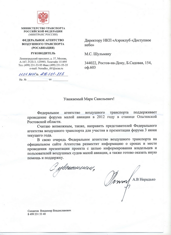 А.В. Нерадько писал(а):Федеральное агентство воздушного транспорта поддерживает презентацию Форума малой авиации в 2012 году в станице Ольгинской Ростовской области.
