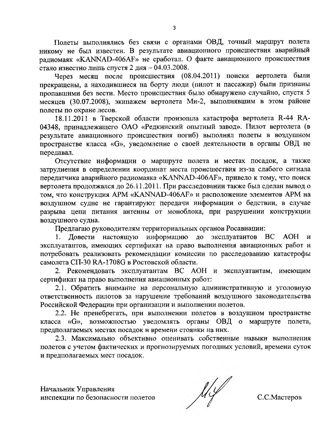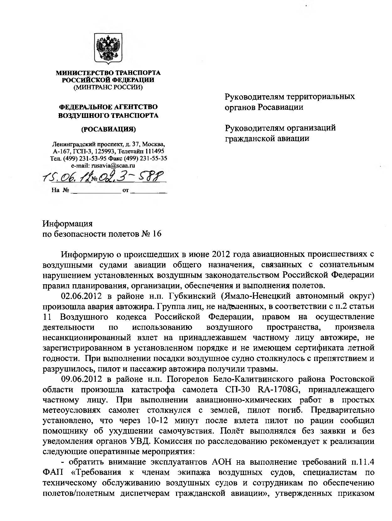 1. Довести настоящую информацию до эксплуатантов ВС АОН и эксплуатантов, имеющих сертификат на право выполнения авиационных работ и потребовать реализовать рекомендации комиссии по расследованию катастрофы самолета СП-30 RA-1708G в Ростовской области.