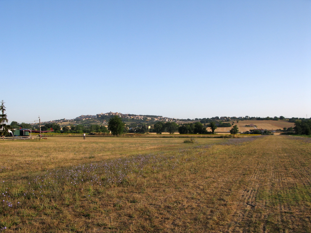Анкона нас не слышит, даже позывной не разбирает, дает качество связи 5/2 и 5/1. Мы сзади выше, поэтому я пытаюсь запросить, мне отвечают, хотя качество связи все равно плохое – он за горой сидит, волна не проходит и я ему говорю, что мы уже садимся и не надо о нас беспокоится. Говорю до свидания, но не уверен, что он услышал. Переходим на частоту Recanati, на ней никого (кроме нас) не слышно. Подходят уже координаты точки, а ее нет – полосы не видно. Возникает легкая паника, думаем, что ошиблись координатами, или на сайте наврали – тогда ошибка у всех. Проходим указанные координаты и встаем в круг, спереди Foxtrot, сзади RA и мы на Echo, вообще зрелище очень красивое – на фоне зеленых холмов идут два самолета, как белые бабочки порхают. Я такое видел только давно давно, когда летал в Америке, в районе Сан-Франциско постоянно летают парапланы и дельтапланы. Но полосу пока не видим, стоим в правом кругу, делаем разворот раз, второй и на втором кругу Foxtrot говорит, что полосу увидел. Он ниже нас, мы еще пока не видим ее. Делаем за ним проход и видим полоску, осматриваем подходы, проходим и левым кругом начинаем строить заход.