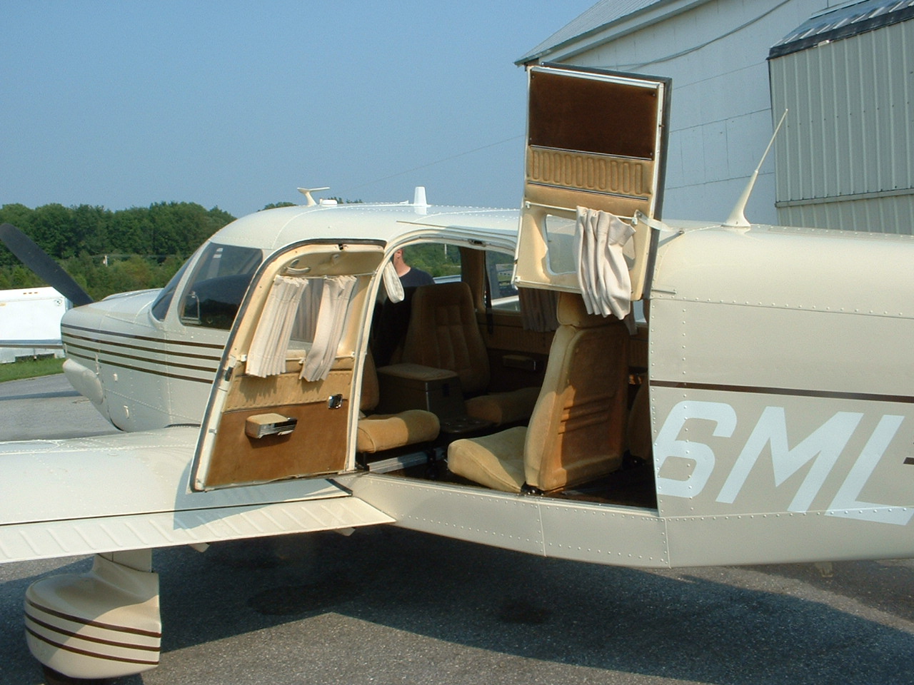 Левая дверь расположена в задней части фюзеляжа и открывает вход к заднему(третьему) ряду сидений и к заднему багажнику. Дверь довольно широкая, ступенька низкая, подножка в общем-то и не нужна. В качестве опции предлагалась дополнительная створка, открывающаяся вверх. Незаменима для загрузки крупногабарита или носилок например. Один американец (Joe Alinsky) писал, что перевозил на самолете пианино весом 400 фунтов (180 кг). Естественно кресла 2-3 ряда были сняты.