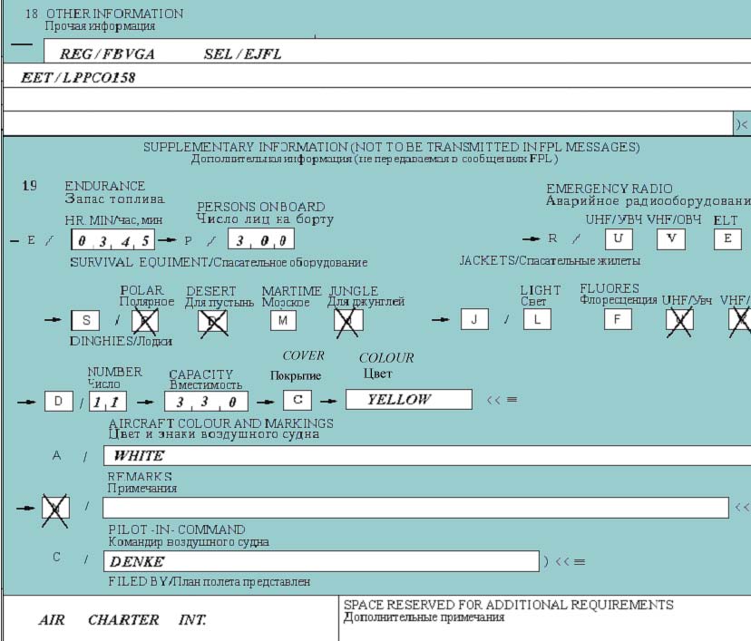 Ну да, есть такие аэропорты. Но там лежат бланки и стоит факс-машина. Не думаю, что это приложение будет востребовано - все равно надо владеть "птичьим языком" заполнения планов (имею ввиду прежде всего маршрутную часть и ЕЕТ). Вот fpln.ru дает формализацию плана, что бывает удобно (для меня особенно удобно ЕЕТ)notarget писал(а): В некоторых ретро-аэропортах диспетчера просят/требуют заполненный FPL на бумаге (по информации от пилотов).