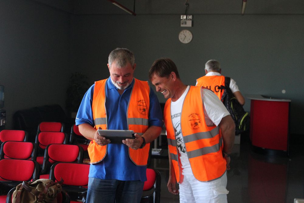 Голодные и уставшие: Ну-с, приступим: "Понимаешь, говорят земля круглая, и мы решили проверить!" - Миша наглядно и в деталях объясняет цель кругосветки португальскому коллеге.