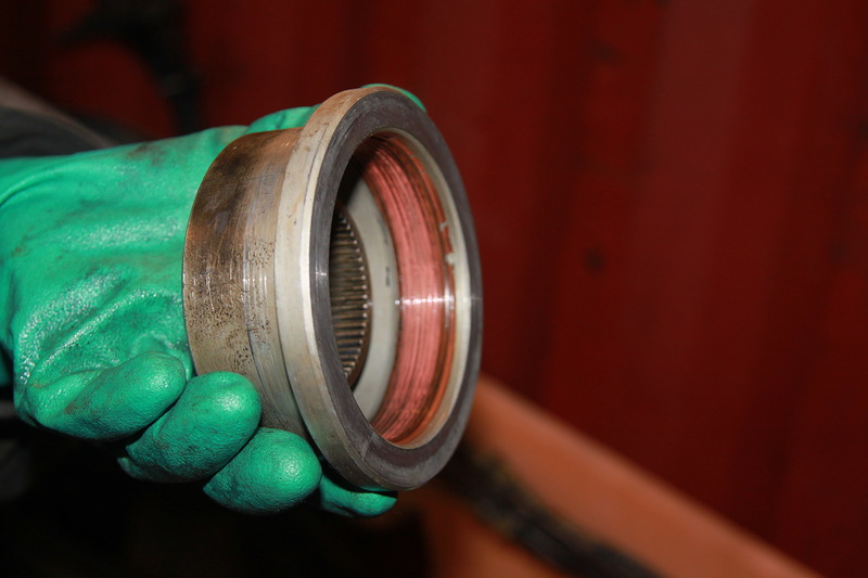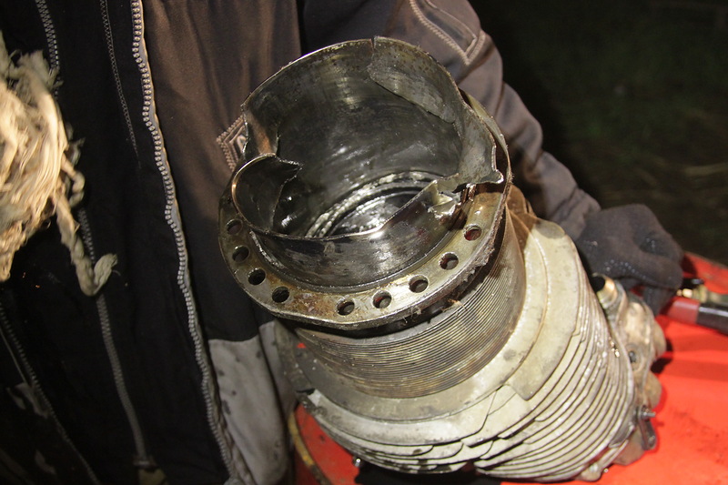 Надо снимать цилиндр! Приступили к снятию шлангов, дефлекторов, проводников…. Цилиндр один из самых неудобных для демонтажа. Александру пришлось изготавливать специальные ключи. Как в сказке – три дня и три ночи мы бились чтобы снять цилиндр. И вот - все подходы подготовлены, цилиндр можно снимать, 20 держащих его болтов вывернуты, но цилиндр не выходит... Тут то становиться ясно, что все плохо - замятая юбка не дает свободно выйти цилиндру. В итоге пришлось фактически выкорчёвывать цилиндр из двигателя.