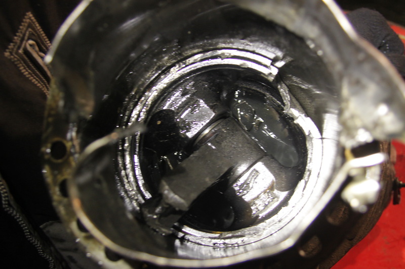 Снятый цилиндр. Юбка замята Поршень и обломок шатуна Когда сняли цилиндр, стало ясно что произошёл обрыв шатуна. И случилось это достаточно давно т.к. отсутствовал фрагмент длиной около 10 см и концы обломков шатуна были прилично забиты. Значит, мотор достаточно длительное время работал в таком состоянии, кроша огрызком шатуна юбки других цилиндров, противовесы, поршня…