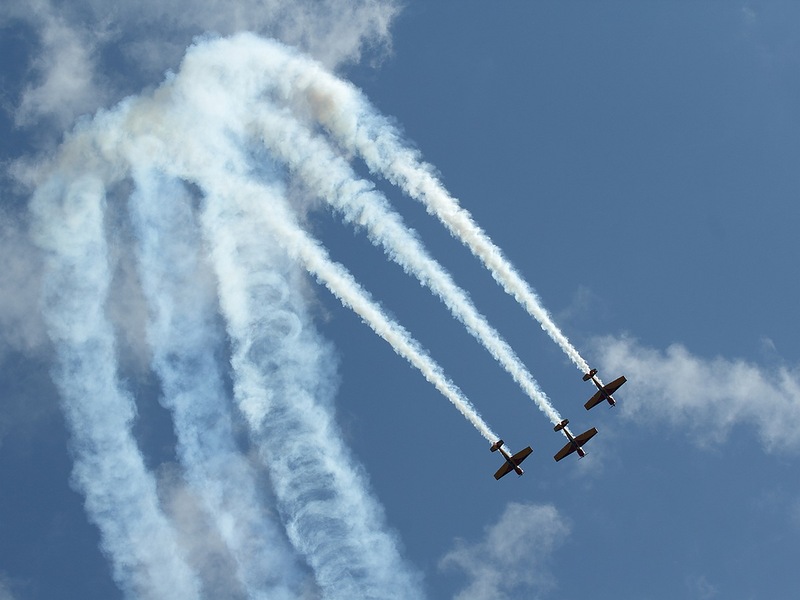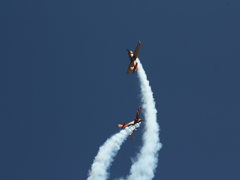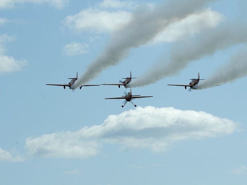 Первым в небе появляется Саша Андреенков на Экстре. И крутит. Народ тоже крутит. Головами.