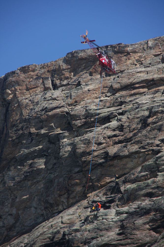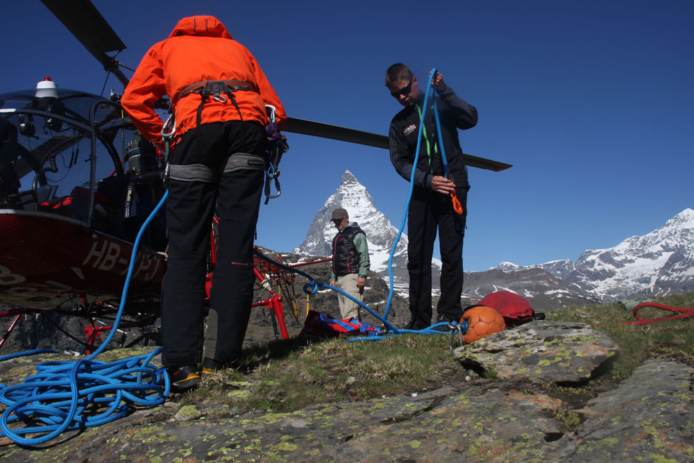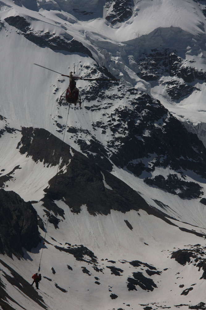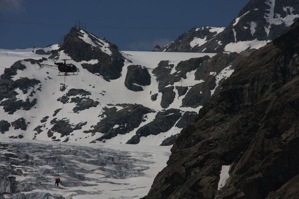 Зона работы над ледником Монте Роза. В нашей команде 6 человек. Два инструктора-пилот и спасатель. Два наших пилота, спасатель-курсант и флайт ассистент. Его задача подготавливать систему. В полете он сидит взади пилота и выполняет еще одну задачу. В случае непредвиденных   обстоятельств, он должен ножом, только по команде пилота отрезать дополнительный страховочный фал внешней подвески. Раскладной нож в течении всего полета он держит в руке. Все максимально продумано. Конечно швейцарцы могли бы сделать дополнительную систему сброса с рычагами и предохранителями (она кстати была раньше). Но в результате все равно они пришли к раскладному ножу и специальному человеку. "Срезать" людей с троса нужно как минимум решение двух людей в вертолете.