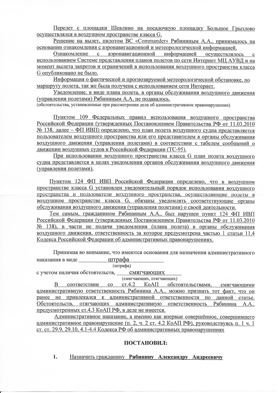 После проверки, проведенной Росавиацией, нарушитель был установлен. Им оказался А.Рябинин, в отношении которого было возбуждено административное дело. Пилот поднялся в воздух, не предупредив об этом диспетчеров. В ходе проверки удалось выяснить, что у мужчины также просрочено свидетельство пилота-любителя и отсутствует сертификат летной годности. В итоге пилота оштрафовали на 2 тыс. рублей.