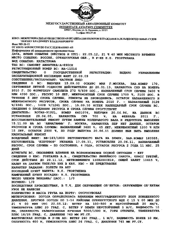 Re: 23.05.2012 RA-1151G Катастрофа Авиатика 890СХ, Оренбург