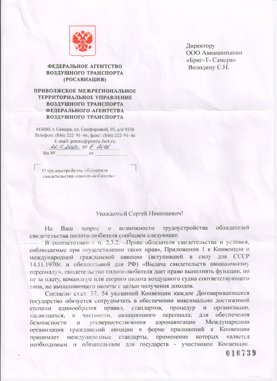 вот что ответила Приволга на наше письмо о трудоустройстве пилота-любителя502 писал(а):Может лучше Вы докажете почему это юр.лицо не сможет взять на работу пилота с PPL? Где такой запрет установлен?zemnik писал(а):Обрадуюсь, если докажете обратное.