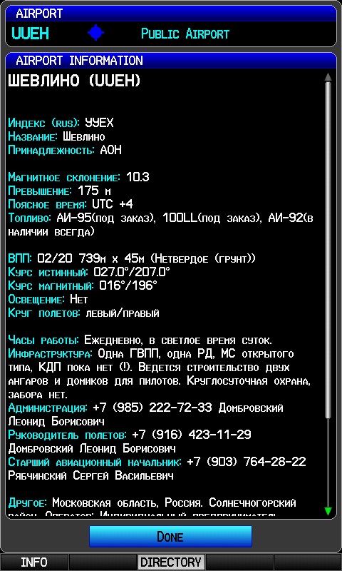 Из страницы "СПРАВКА" вы можете узнать контактные телефоны аэродромных служб, коды SITA и AFTN, более подробные данные о впп, информацию о топливе, частотах, гостиницах рядом, такси, базирующихся на аэродроме компаниях и многое, многое другое.