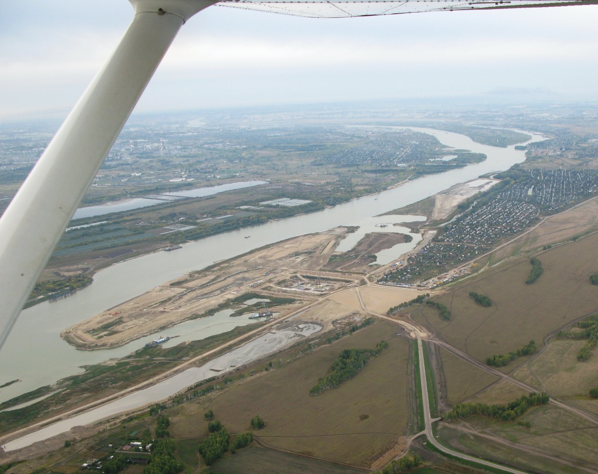 Омск, река Иртыш, усильными темпами строится плотина на реке.