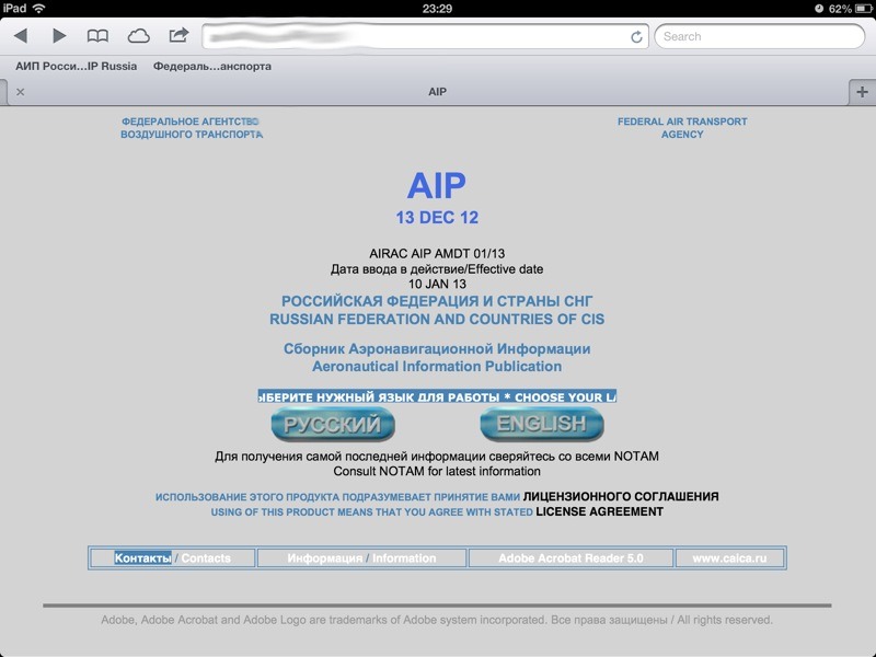 Есть такой ресурс адрес: (реклама_запрещена.net) на котором выкладывается регулярно текущий и следующий AIP Российская Федерация и страны СНГ. На русском и на английском. Все в PDF. Все хорошего качества и можно забрать как весь одним файлом, а потом вырезать нужные листы Adobe Acrobat. Либо можно сразу качать отдельные страницы (по аэропортам). Для планшета очень удобно! Ничего переформатировать не приходится и все "правильное".