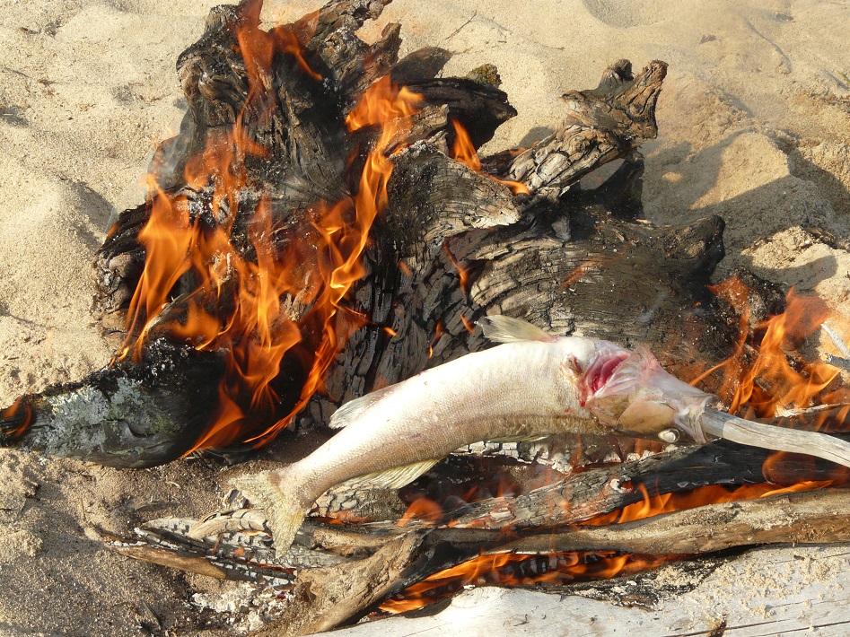 Судак подаренный рыбаками оказался весьма кстати. Я допустил оплошность при подготовке к перелёту взяв из продуктов только половинку черняшки, пачку сосисек и пакет огурцов с огорода. Судака приготовили как первобытные люди посолили и как то очень быстро съели. Запивали чаем(компотом?) из брусники собранной Андреем. Было очень тепло. Вечер наступал, усталость давала о себе знать. Мы наложили в костёр брёвен и быстро отрубились.