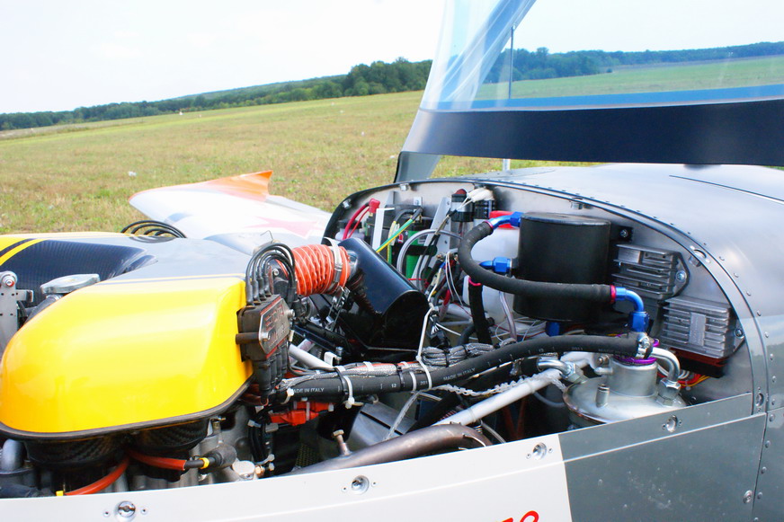 На пилотажнике стоит двигатель впрысковый Rotex 1.3l 130л.с. итальянской форсировки. Доп бак 10 литров для обратного пилотажа, увеличеный маслобак с возможнстью отбора масла в перевернутом полете, и даже бак для дымов,