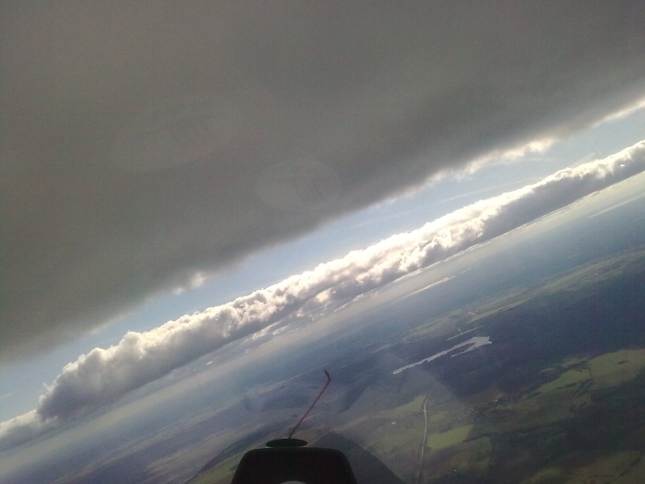 На всякий случай выбираю кромку. Уже 1600 - хороший запас для штурма неизвестности. Ручку от себя. Как учили, набираю скорость еще в потоке и выхожу из-под облака. Чуть прибираю ручку и планер взмывает даже немного выше основания облака. На качестве продвигаюсь дальше. Любуюсь окрестностями и запоминаю характерные ориентиры. Вот справа, вдалеке два диких озера с заболоченными берегами. Дальше за ними должен быть аэродром, но его уже не разглядеть. Мелькает мысль, что просто так, с одного набора туда уже и не дойти. Даже с попутным ветром. Лечу…