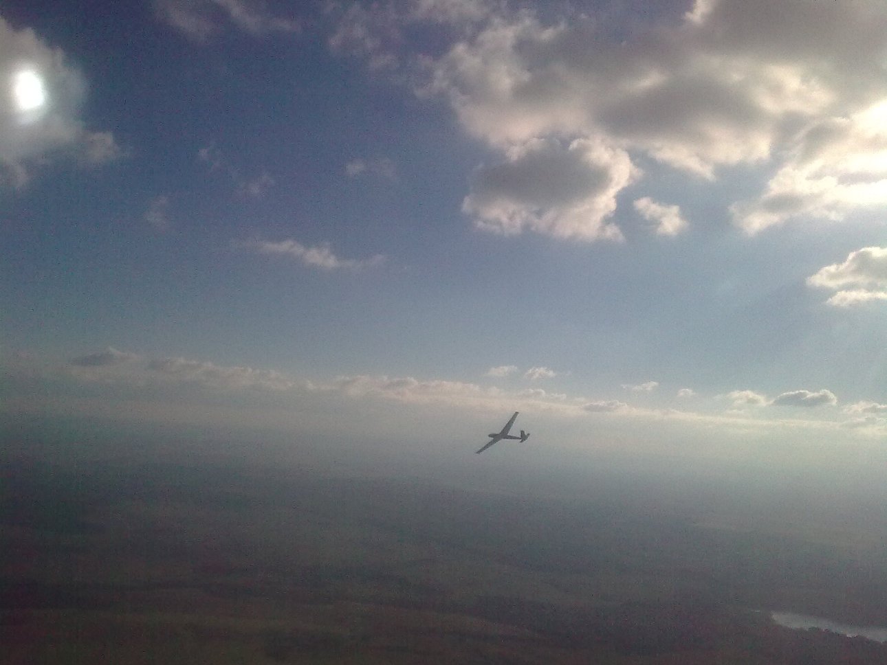 Мы опять остались на двух планерах, в одном потоке. Поднимаемся. Скоро упремся в нижнюю кромку облака. Как будто и не было ничего. Но пришелец ведь был! Я его видел. Вот и фото имеются. Почему исчез? Что смутило или испугало? Загадка…