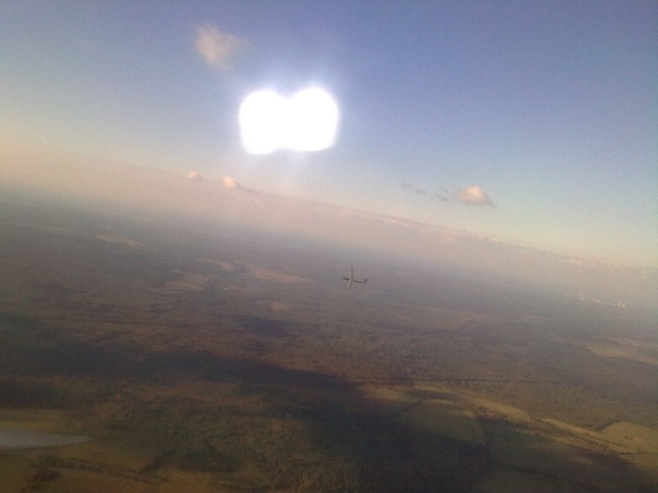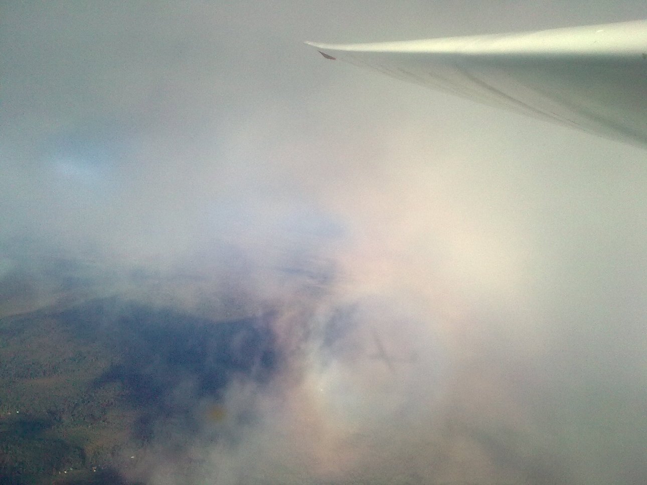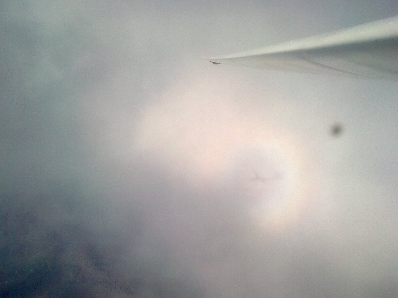 Не выдержал и прошелся еще раз между солнцем и облачком, чтоб полюбоваться этим явлением. Здорово! Но такую идиллическую картину опять нарушил невесть откуда взявшийся НЛО. Маленький, черный шарик с размытыми краями деловито подлетел, повисел немного под крылом и улетел по своим делам.