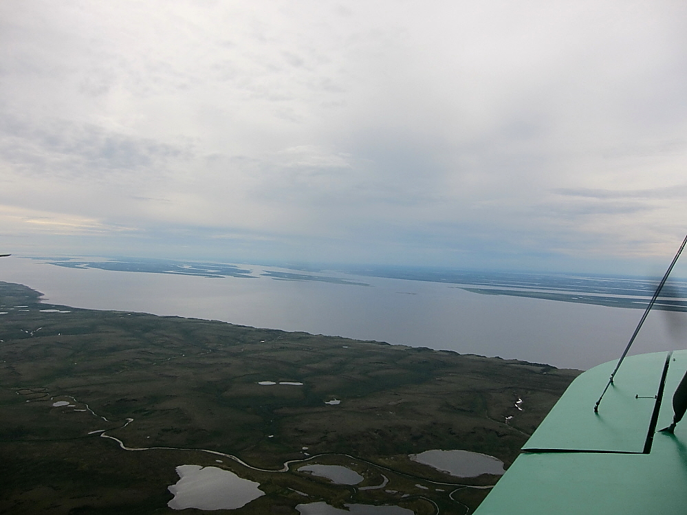 Чем ближе к Дудинке, тем сильнее нас скрывает от Земли нижний край облачности, еще немного и.. Пробиваем ее! Не тут то было, сплошная пелена жмет к Земле, снижаемся до 150. Поверхность ровная, нет здесь ни гор, ни мачт, ни вышек сотовой По-2 скользит над водой и чахлой сушей в холодном воздухе, временами стекло козырька покрывает морось, разбитого винтом дождя.