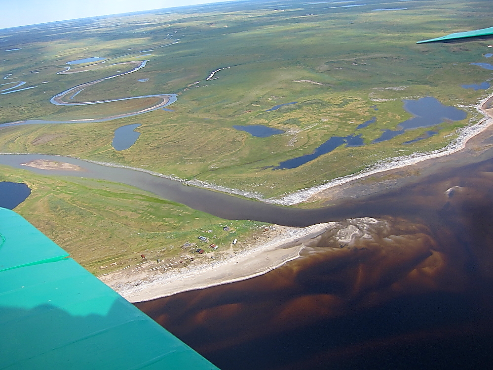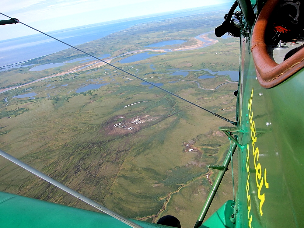 В подтверждении активного судоходства прошлых лет, замытые песком и выброшенные на берег встречаются корабли Здесь по берегам Енисея, много брошенных зимовок и бывших рыболовецких баз, колхозов. Вот под нами одно из таких оставленных поселений. В восемнадцатом веке здесь было старинное русское зимовье Троицкое, в нем останавливались участники Великой Северной экспедиции, а руководители отрядов Семен Челюскин, Харитон Лаптев, Дмитрий Овцын заносили их на первые карты Енисейского залива По-2 постепенно приближается к бухте Сопочная Карга Я говорю Павлу по переговорному о полярной станции Соп.Карга, которая находится на краю одноименного мыса, острым ногтем закрывшим бухту от западных ветров Проходим прямо над домами, надо поддержать полярников! Знаю, что "полярка действует, одна из немногих из диксонского гидромета, что еще держится на плаву, в том числе благодаря мужеству работников Время полета, без пятнадцати минут, составляет 3 часа От Сопочной Карги до Диксона остается 200 километров, мы спрямляем маршрут и самолет послушно уходит от береговой черты в тундру