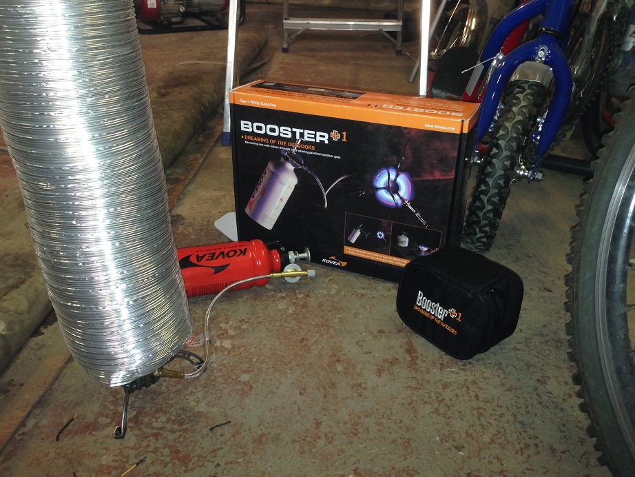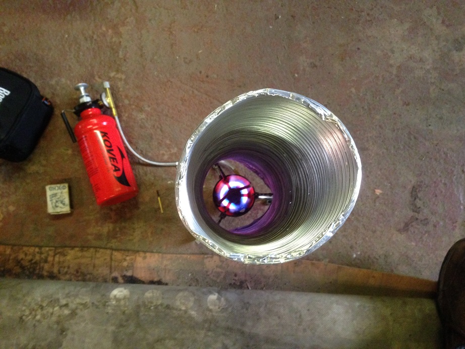 Работает на газу и на бензине. Горячий поток воздуха идет под хорошим напором. Температура на выходе из трубы примерно градусов 80-90. На морозе наверное по прохладнее будет. Попробую на днях к вертолету приладить. Все вместе весит около 1 кг.
